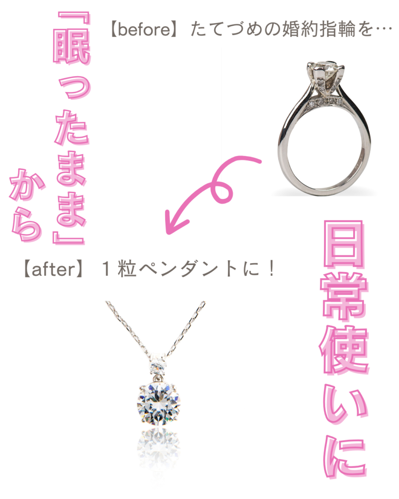 リフォーム&メンテナンス 随時承ります! 投稿公開日:2025年5月22日 眠っているジュエリーを美しく蘇らせてみませんか? タンスの肥やしになっているジュエリーや受け継いだジュエリーを ご自身のライススタイルに合ったデザインに‼ また、切れてしまったチェーンの修理、リングのサイズ直し、 小傷のついたリングの磨きなども承ります。 お見積もりは無料です。お気軽にご相談ください。